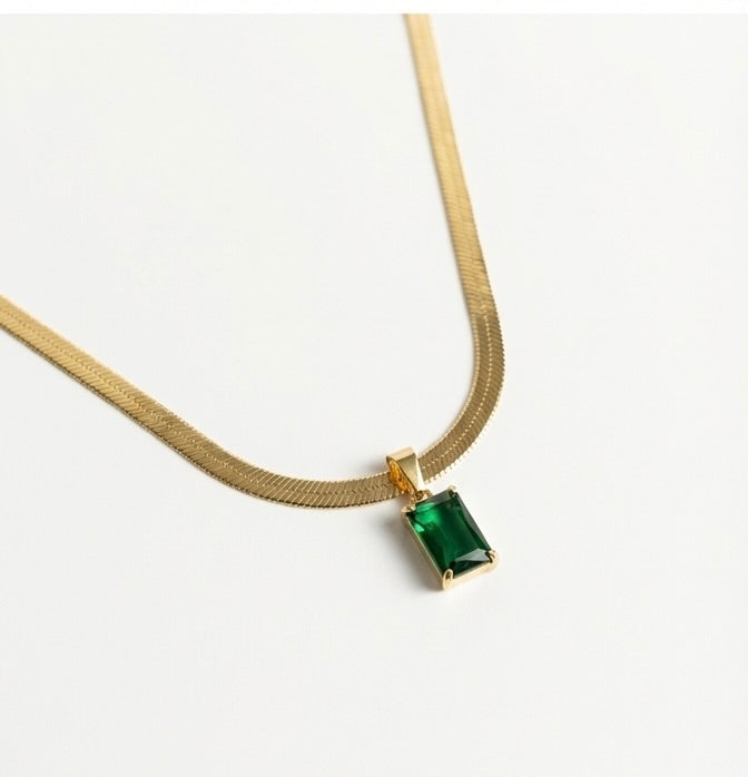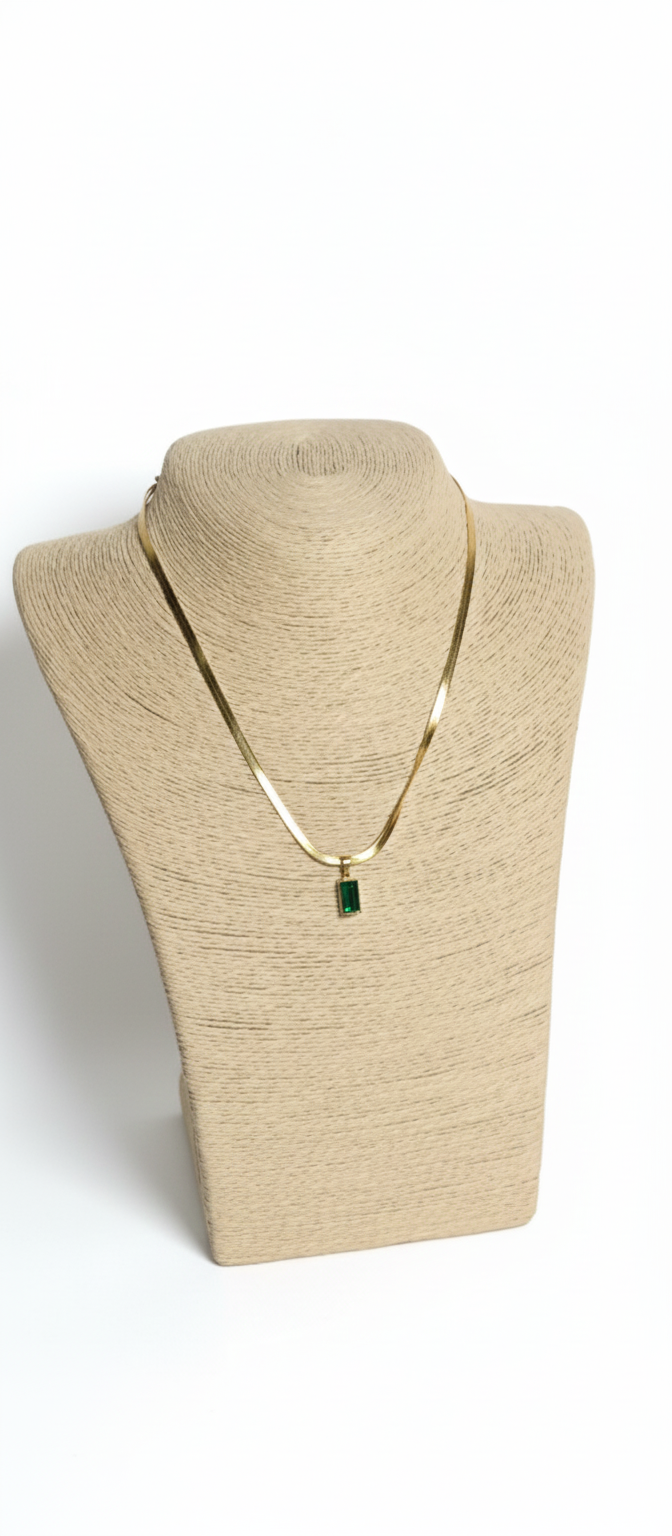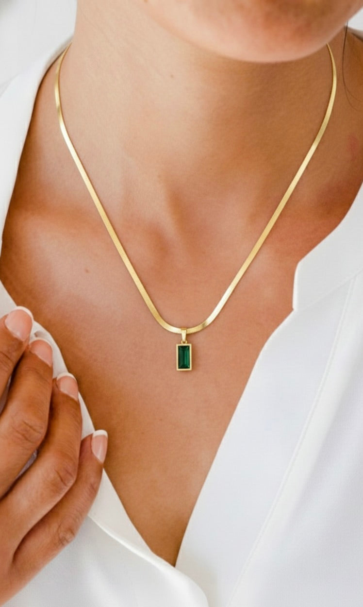 Add a pop of color to your style with the Lumia Green . Featuring a sleek snake chain in a luxurious gold finish, this piece is adorned with a vibrant emerald-green pendant for a bold and elegant statement.